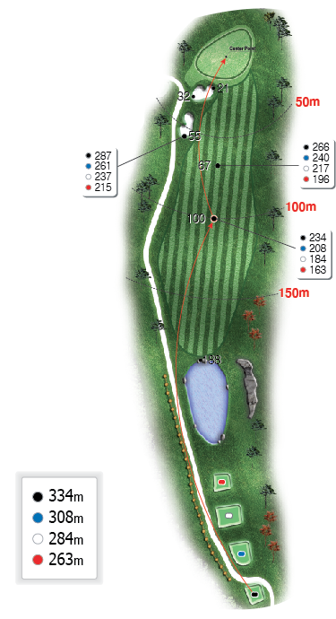 골프코스 전체가 한눈에 다 보이는 풍광이 수려한 짧은 내리막 우 도그랙 파4홀이다. 시야가 탁 트여 티샷의 목표방향을 잃기 쉬우나 첫 번째 벙커가 무난하다. 비교적 숏아이언으로 충분이 온 그린이 가능하므로 한번 버디를 노려 보자.